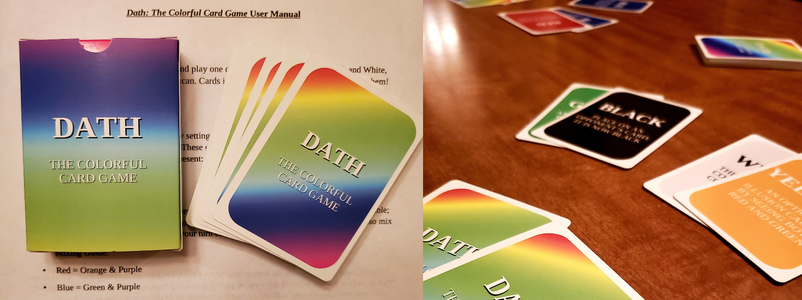 Black and White cards do not count towards a player’s collection, and are not required to win the game, but they do provide beneficial effects if played. White cards count as any color while mixing, while Black cards can cover up your opponent’s cards, thus forcing them to obtain that color again.