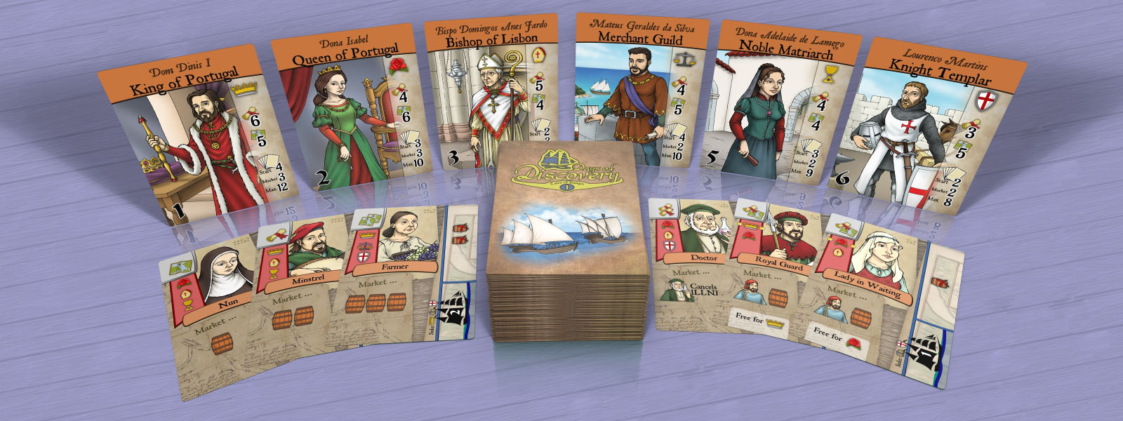 Players recreate this accomplishment in a game that plays out as a 3-act story. First, draft cards representing people who have evidence of the hidden land and plans to get there, in order to gain sponsorship from 1 of 6 important figures. Second, use the resources from your sponsor to draft cards representing the supplies and crew needed to make the journey. Finally, sail the treacherous seas to discover the "Land of Danger" by using your hand of cards to pay for the costs of the voyage.