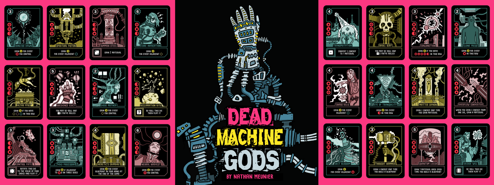 Dead Machine Gods is a strategic cyber-occult worker placement and tableau building mint tin game for 1-2 players. Set in a world of dark magic, occult technology, and haunted machinery.