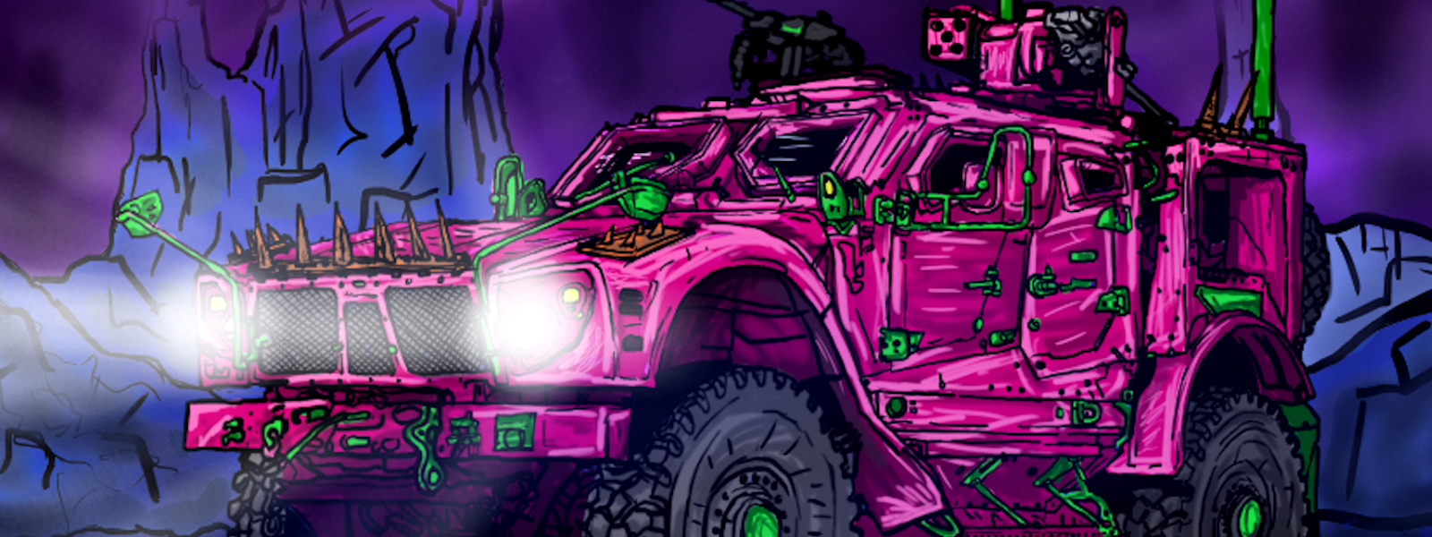 The Death Derby Militia Theme Deck combines vehicles with turrets, large weapons, and more for the capacity to do huge amounts of weapon damage. The deck is supported by repair cards and Critical Hits, including weapon modifications from The Armory Expansion and the Quad .50 promo card.