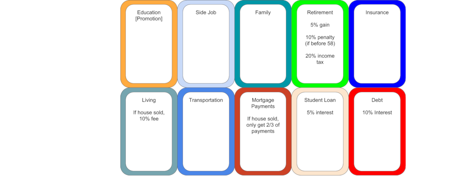 Game Winning Condition Co-op: All the players finished Debt Free goal before anybody reached age 59 Competitive: first one reached all the goals.