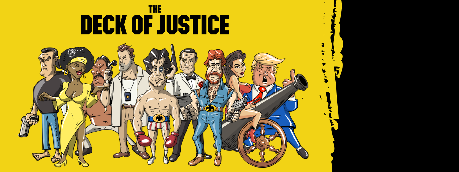 The Deck of Justice is a ridiculously frantic, yet highly tactical, hand-drawn card game for 2-5 players. Players take turns striking one another (with fully loaded heroes, armored vehicles and bulging biceps) in a series of quick cowboy standoffs until there is only one survivor.