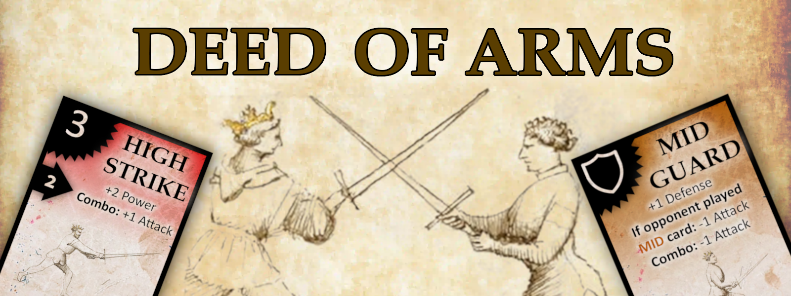Deed of Arms is a fast-paced game of knightly combat for 2 players. Each round, players will play a card from their hand to either strike their opponent or to guard themselves.