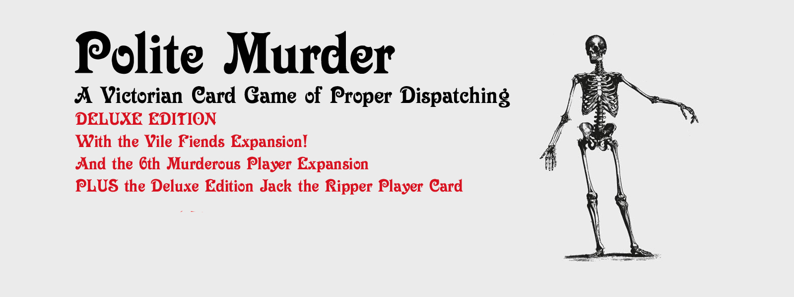 The deluxe set of Polite murder includes: 36 Action cards 12 Character cards and 1 Deluxe exclusive Character card of Jack the Ripper! 1 Six Sided Die (D6) All cards have a linen finish for durability.