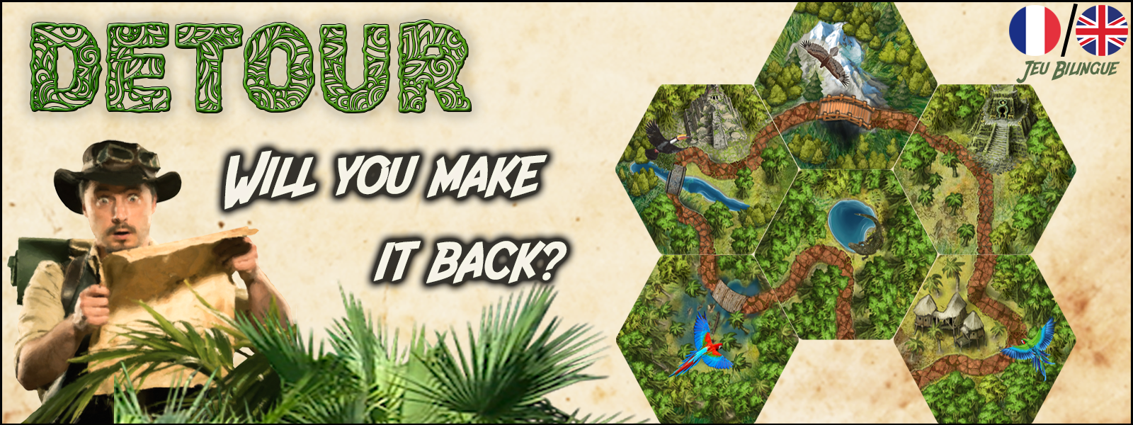 The goal of DETOUR is to score the maximum number of points making a trail that comes back to its starting point. It seems simple but you will enconter obstacles and unexpected Detours on the way that your opponents may place to slow you down. Will you do the same at the cost of your own turn? Will you build a short trail or one that meanders through the jungle worth more points?