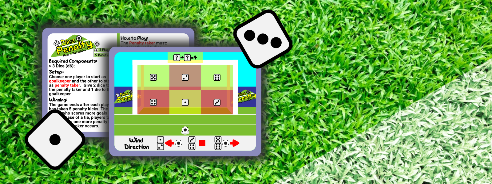 How to play: The game has 10 turns. Each turn the players alternate roles. One player is the penalty taker and the other one is the goalkeeper. The penalty taker secretly rolls two dice, announces the sum of the dice and chooses one of them to define where to kick the ball, keeping it hidden. The goalkeeper rolls a die to see if the wind will move the ball, and then places his finger where he will try to defend the ball. Trying to deduce where the penalty taker has kicked the ball. After that, the players reveal their dice and check if it was a goal. The player who scores more goals wins.