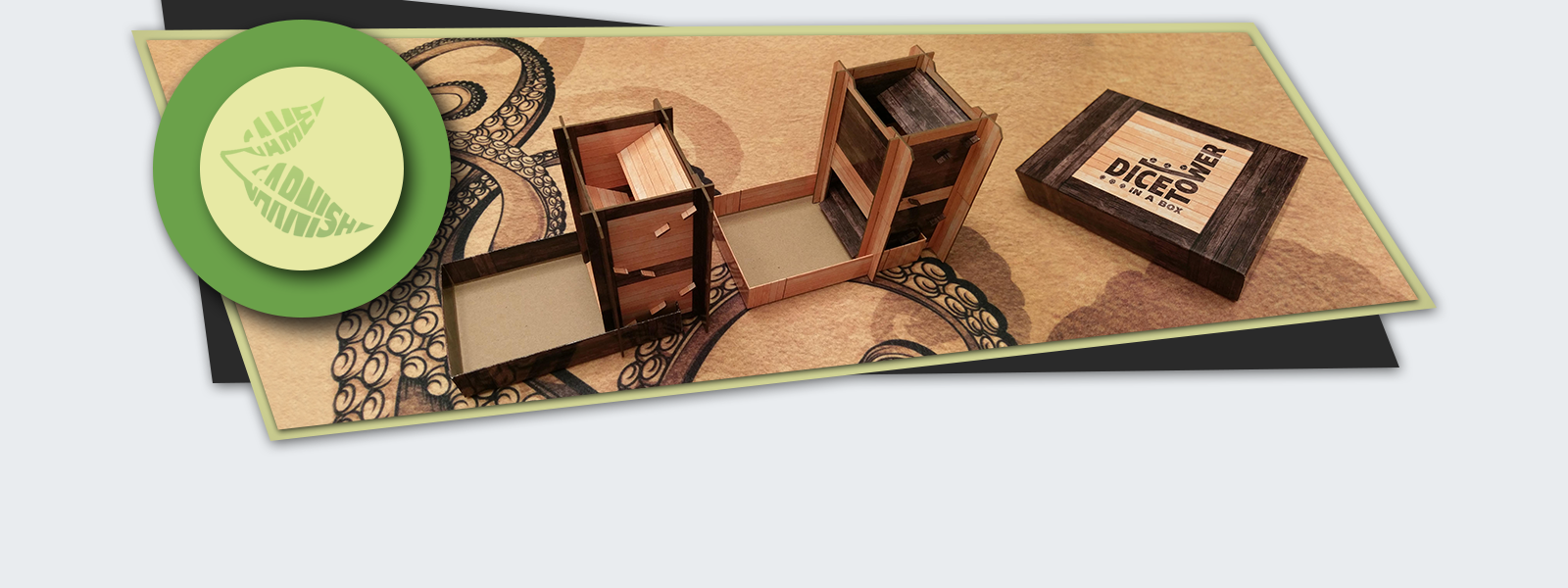 Dice Tower in a Box is a dice tower made from chipboard that fits into a small box when disassembled, making it easy to transport. When assembled, the tower attaches to the box top, which acts as a tray when rolling dice.