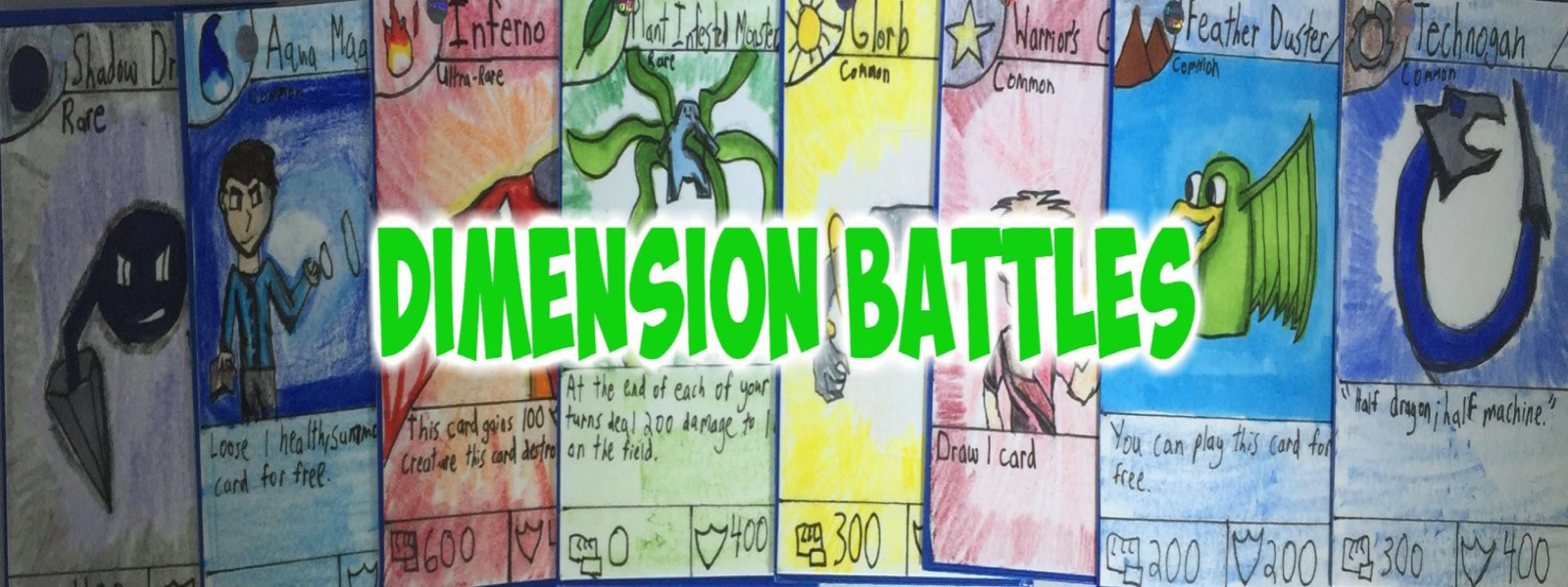 Dimension Battles is a trading card game where you collect cards to defeat creatures and items from other dimensions. It is a game where 2 people take on each other in battle. Each deck contains 30-40 cards. Players take turns drawing cards and summoning creatures to fight for them.