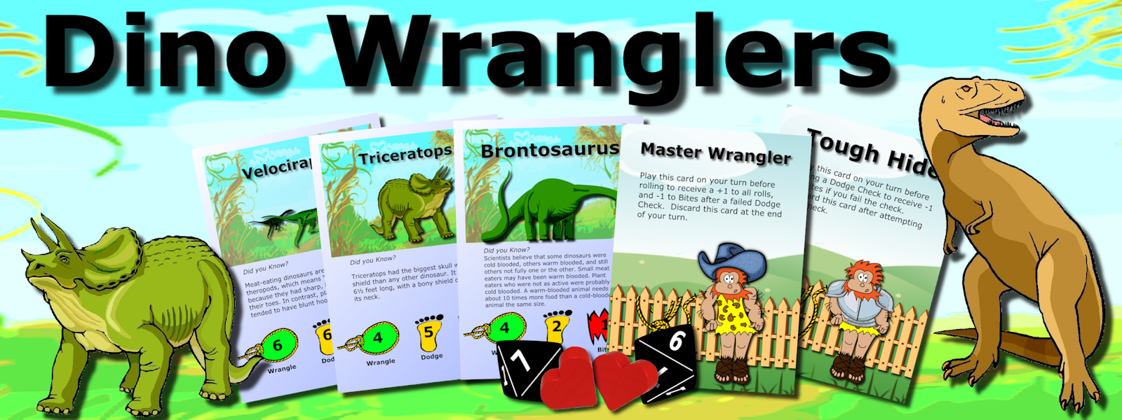 In Dino Wranglers, you are a caveman with an empty ranch. You try to wrangle the dinosaurs in the field and fill your corral to collect points. However, if you fail, you must dodge their teeth or get bit. Play Wrangler Cards to help your Wrangler Checks, or to hinder your opponents. When all of the dinos have been wrangled, the caveman rancher with the best dinosaur ranch wins!