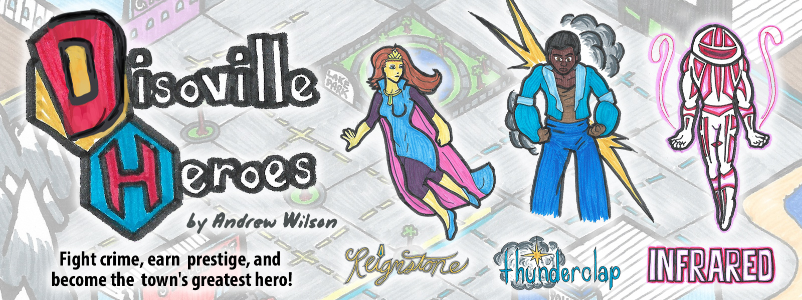 Disoville Heroes is a dice-drafting, action-selection game in which players use asymmetrical player powers to train up powerful superpowered abilities i so they can fight the emerging crime within the town and become the most popular superhero.