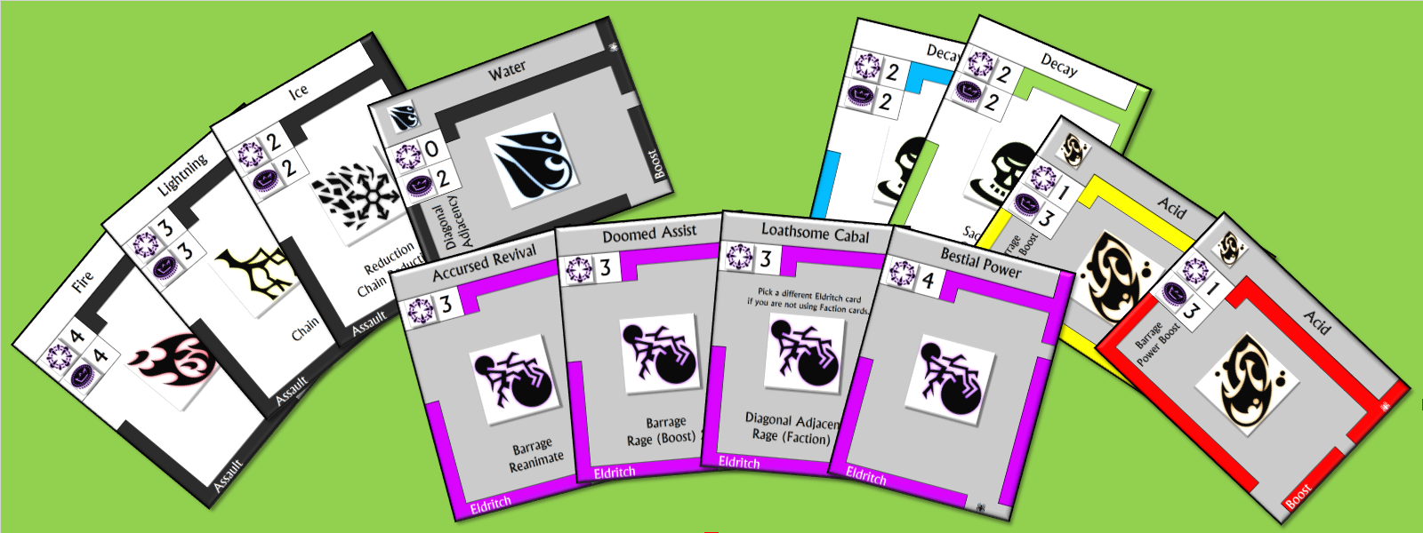 There are also 5 new Eldritch cards. Eldritch cards represent ancient, forbidden magic that may be used by anyone. Eldritch cards are Assault cards that belong to no faction. Anyone may use them on their turn.