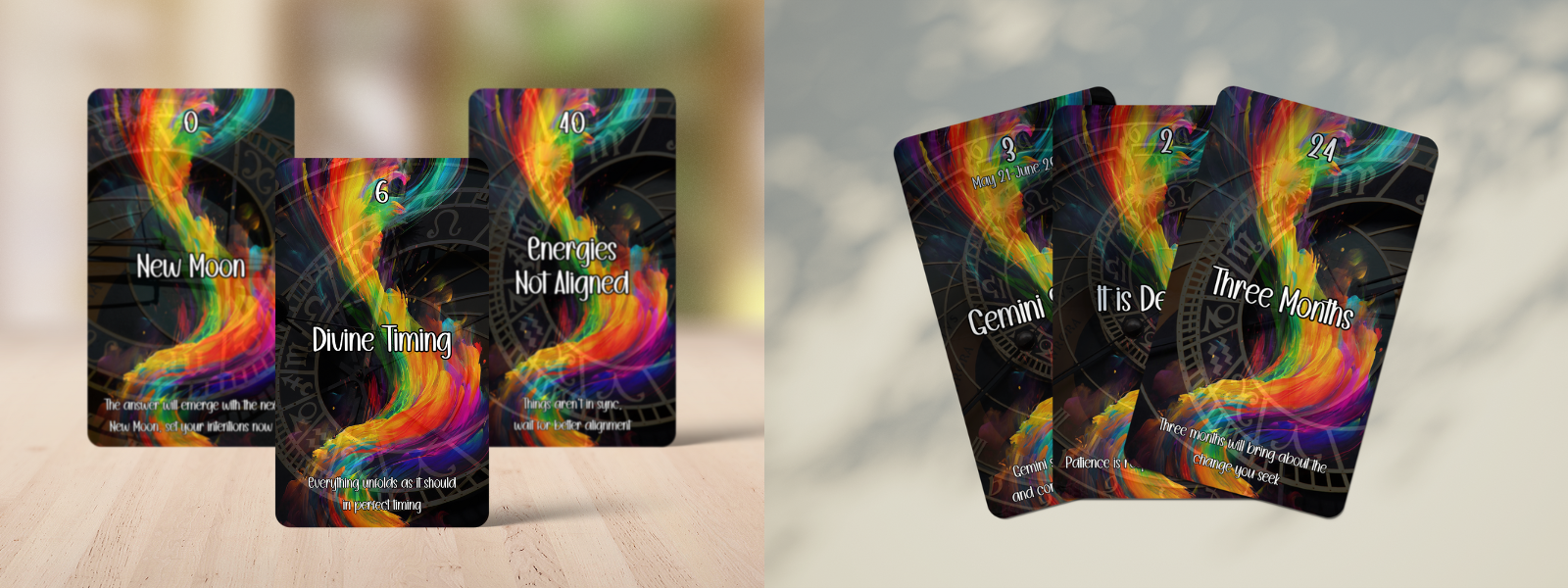 The Divine Vibes Timing Oracle deck is a powerful tool designed for those seeking clarity on the timing of events in their lives. Whether you're looking to uncover when something will happen or seeking divine guidance on a situation, this deck offers precise answers infused with spiritual insight.
