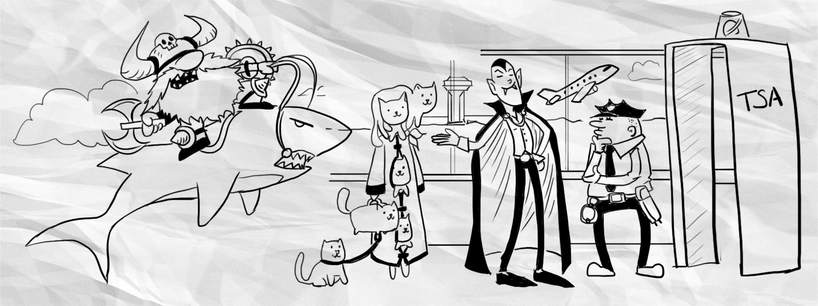 Can you draw a hairy viking soaring majestically through the air on a vicious shark, or Count Dracula smuggling kittens through airport security?