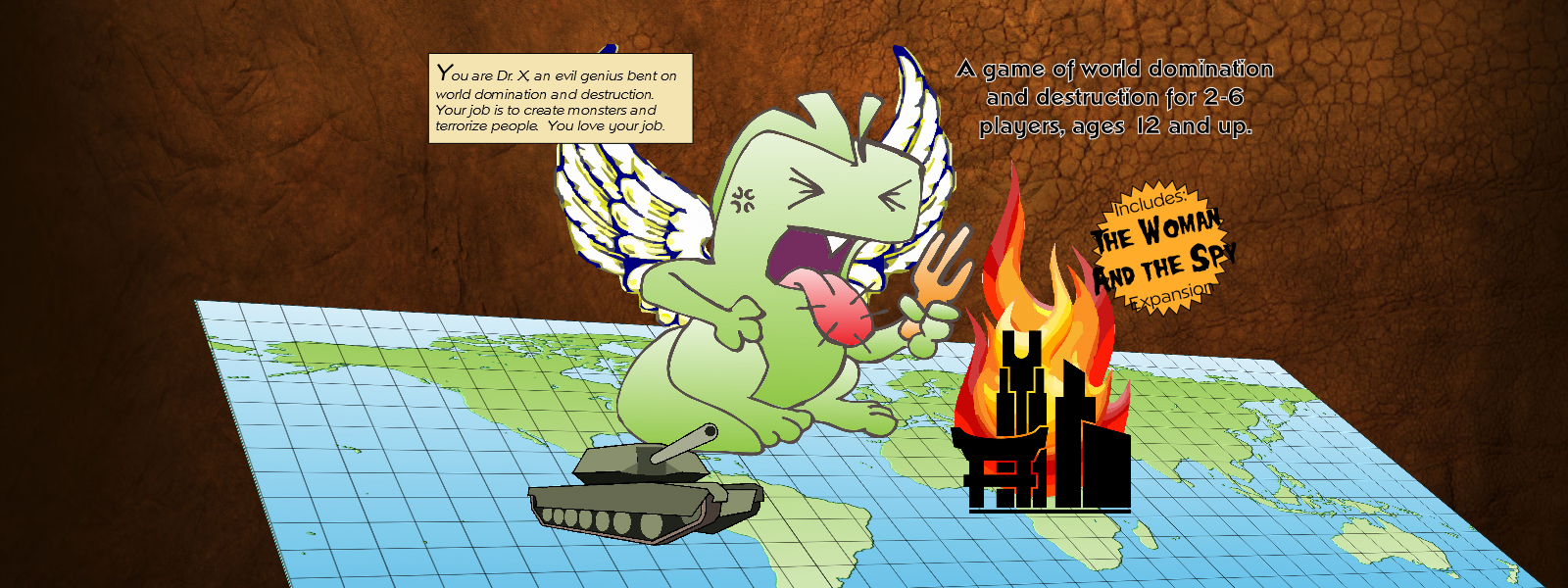 Dr. X's Monster Ranch is a game for 2 to 6 players, in which you and the other Dr. X’s (Dr. Y, Dr. Z, etc.) travel around the world planting monster eggs in various kinds of nests. You do all this just to send the monsters out to stomp on things.