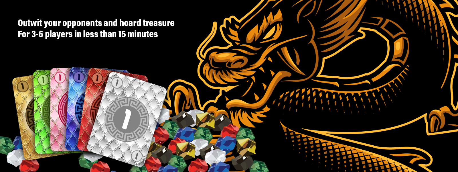 Players start with 9 number cards and a unique secret scoring rule that affects individual objectives. In each simultaneously played round, players predict opponents’ plays in order to gain coveted treasure by attacking a location with one of their cards. Each location’s hoard of gems increases prior to the start of each round, building the tension for players as they grow more desperate to secure their treasure. Growl or gloat through explosive moments when plans either succeed or fail.