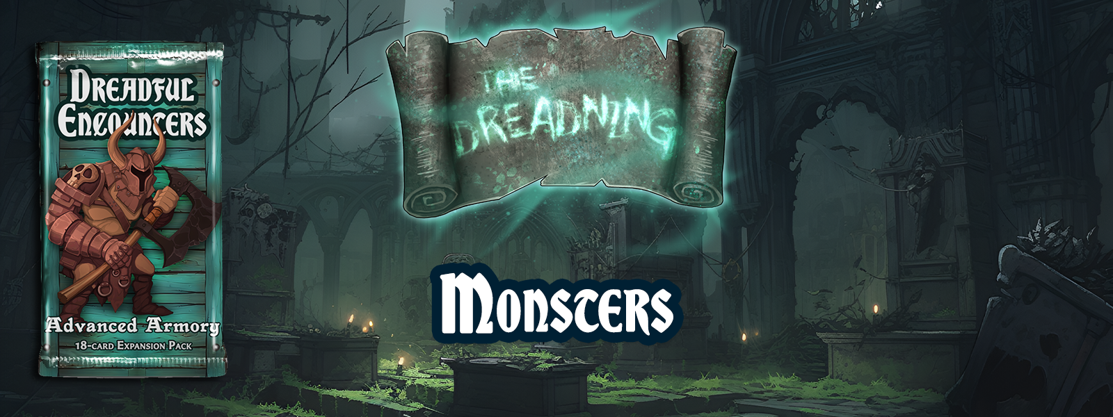 Dreadful Encounters I is an 18-card booster pack that brings classic monster archetypes to Advanced Armory. Each of these monsters represents a typical or generic example of that particular type, keeping them nice and simple. Perfect for use with our Standard format, and for questors of all skill levels and ages.