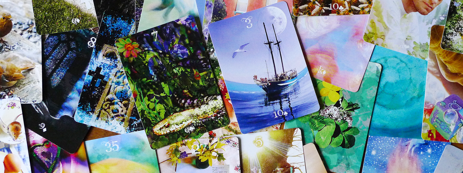 The DREAM INSPIRES Lenormand uses illustrations or scenes created digitally from photographs. The name came about through a lot of thought on my part. I wanted a title that would echo the imagery of the deck, which has elements of myth, symbol and dream, as well as a hint of some of the ancient sacred sites of Britain (for example, number 5, THE TREE, shows Whiteleaved Oak, an extremely old tree often called the witches' oak because people come from all over the world to hang clooties or wish/spell/prayer tokens in its branches; 31, THE SUN, features the head of a sun god from the hot springs at Aqua Sulis, Bath; 22, THE PATHS or ROADS shows a section of Uffington White Horse). I live in Oxford, which is often called the City of Dreaming Spires, so the name of my deck is a play on words that indicates where I live as well as the inspiration of dream and legend.