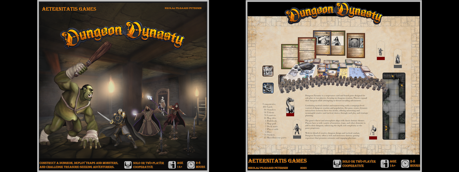 Dungeon Dynasty is a cooperative card and board game designed for solo play or two players, focusing on dungeon creation. Players expand their dungeon while attempting to thwart invading adventurers.