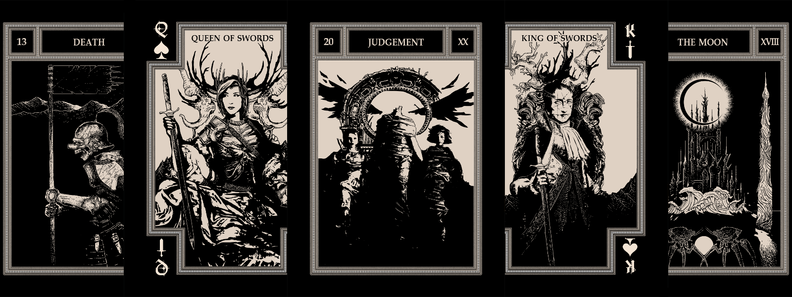 The Labyrinth of Souls tarot cards are exclusively illustrated by Josephe Vandel for the Dungeon Solitaire: Labyrinth of Souls game. This tarot deck includes fully illustrated major arcana, court cards and aces, with numbering based on the Tarot de Marseille. The 2-10 of each suit features easy to read pips. The 90 card deck also features a title card, a logo card, and ten fully illustrated extra arcana cards specially designed for the Labyrinth of Souls advanced game, with titles like Alchemist Fire, Outer Ocean, Holy Mountain, and The Dragon!