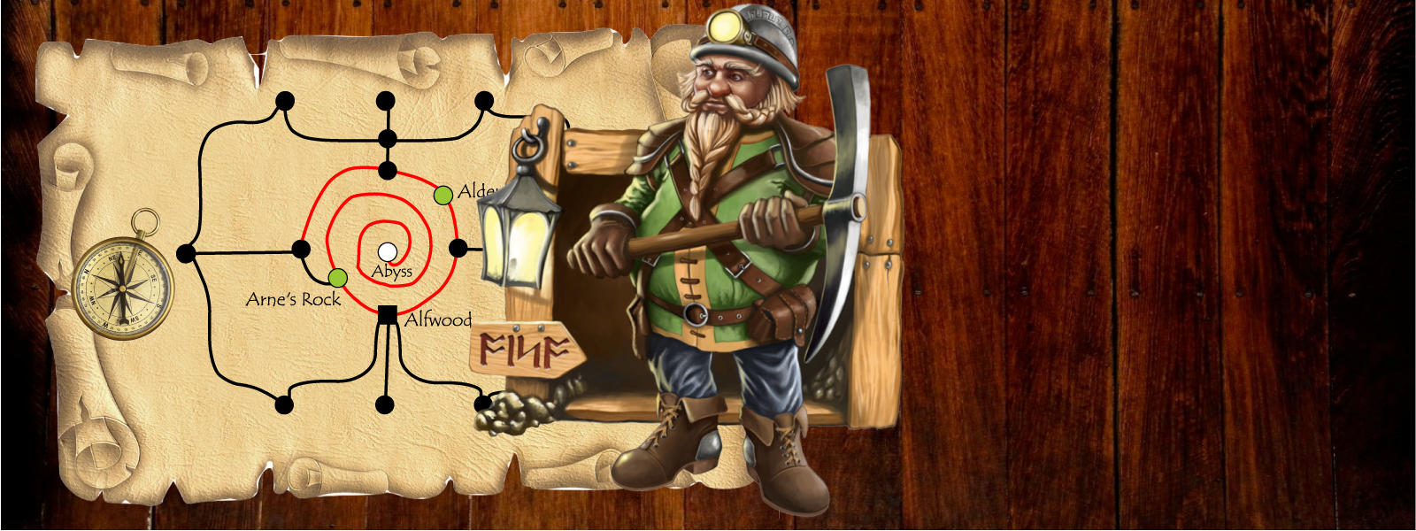 In Dwarven Rails players build tracks between cities and mines. Each mine corresponds to a single mine card that produces a single type of good, e.g. diamonds, rubies, emeralds. Players build track using their surveyors, claim mines using their agents and operate the mines to produce goods. When their track connects the mine to their base they may ship goods home via transports to earn income. They may also construct passenger routes to gain income. Along the way they hire additional surveyors, agents and transports to increase efficiency.