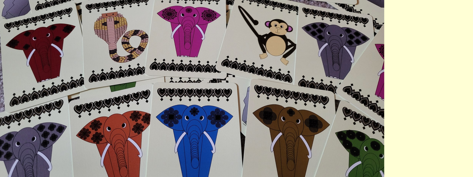Eight Elephants is a 27-card real-time solitaire (or two-player) matching game. The game is played in 2-10 minutes, depending on the difficulty level chosen. The goal is to match and collect all eight sets of elephants before the timer runs out. Rocks stand in your way, but are easily avoided once revealed. Cobras are dangerous and cranky when disturbed. Monkeys are mischievous in their movements, swapping positions with other cards when revealed, and thwarting your attempts to remember the locations of the elephants.