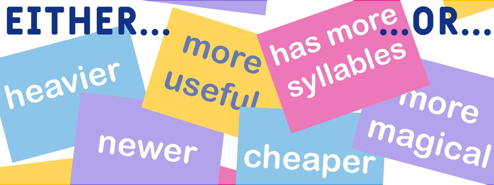 Like Shiritori, players take turns giving words, and the words they give determine what kind of word the next player can say. At the start of Either/Or. the players agree on two conditions that will dictate how players can answer. These are generally comparitive adjectives, like "heavier" or "more useful." A player needs to come up with a new word that satisfies one condition but not the other, when compared to the previously stated word.