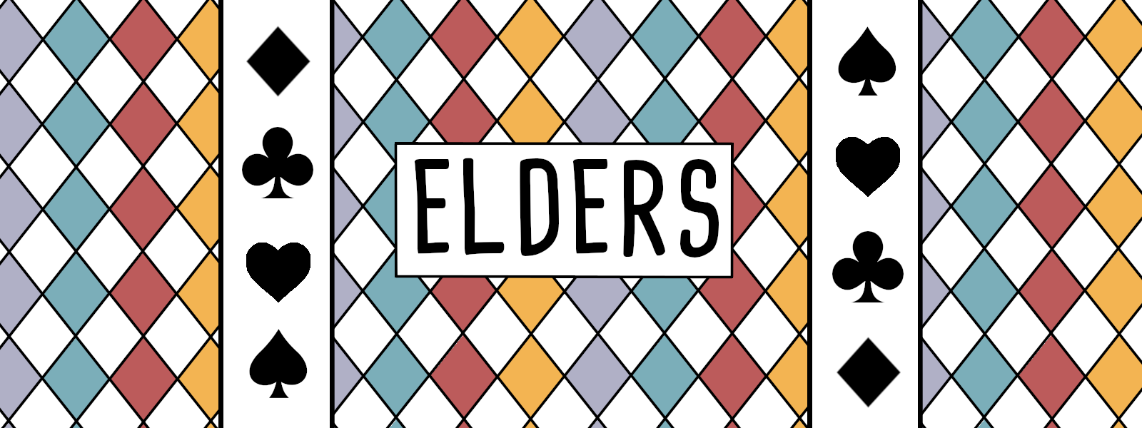 This card pack was originally designed as a university prototype project, however it also doubles as a custom poker deck. In a standard deck there are four suits for 13 different card variations (eg. 2-10 plus Jack, Queen, King and Ace). For Elders, it is the same except each variation is a cartoon depiction of an item, all of which have the theme of "elderly". The 13 items include: Belt, Bow tie, Cane, Dentures, Glasses, Key, Newspaper, Pipe, Purse, Top Hat, Wallet, Watch and Yarn, all with 4 colour-coded versions for each suit.