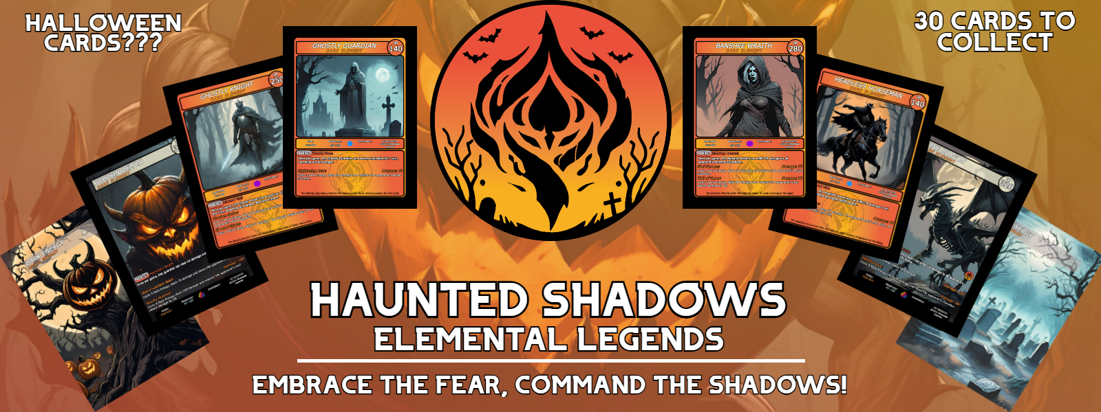 Embrace the darkness this Halloween with the spine-chilling Haunted Shadows booster pack! Dive into the realm of shadows and summon terrifying Guardians and ominous abilities designed to haunt your opponents. Packed with Halloween-exclusive cards, this set brings powerful new strategies and ghoulish surprises to your Elemental Legends deck, perfect for players seeking to master the dark side.