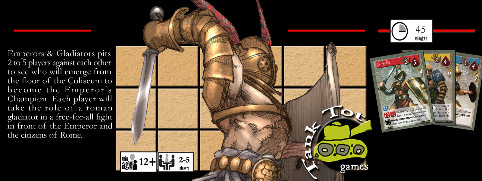 Emperors & Gladiators pits 2 to 5 players against each other to see who will emerge from the floor of the coliseum to become the Emperor's champion. Each player will take the role of a roman gladiator in a free-for-all fight in front of the Emperor and the citizens of Rome. The game is played in rounds, each round has 3 phases: Focus, Maneuver, and Strike. During the Focus phase players will roll their combat dice and select a Focus, defense die, and a maneuver die. In the Maneuver phase, players will manipulate the combat dice by performing moves. The Strike phase is where the combat dice are compared and stamina is adjusted. The last gladiator standing will become the Emperor's Champion.