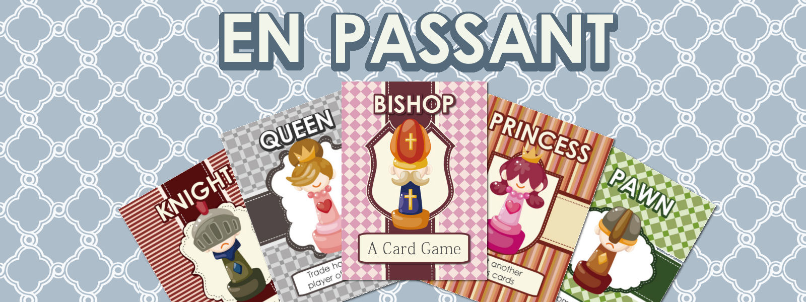 En Passant is a small deck playing card game. The game consists of 16-cards made up of a King, Queen, Princess, Bishops, Rooks and Pawns. Each player receives 4 cards.