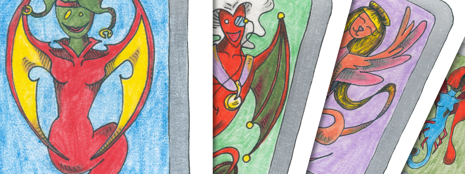 This deck was completed in 3 months without pause with a minimum 10 hours a day laboured by a driven illustrator. All hand drawn, inked and coloured. To mass produce, the only technology used on the images was a scanner to digitize them. Not Photoshopped, the quirks of this deck lie in the whimsy of the images and the unique flaws of a learning hand.