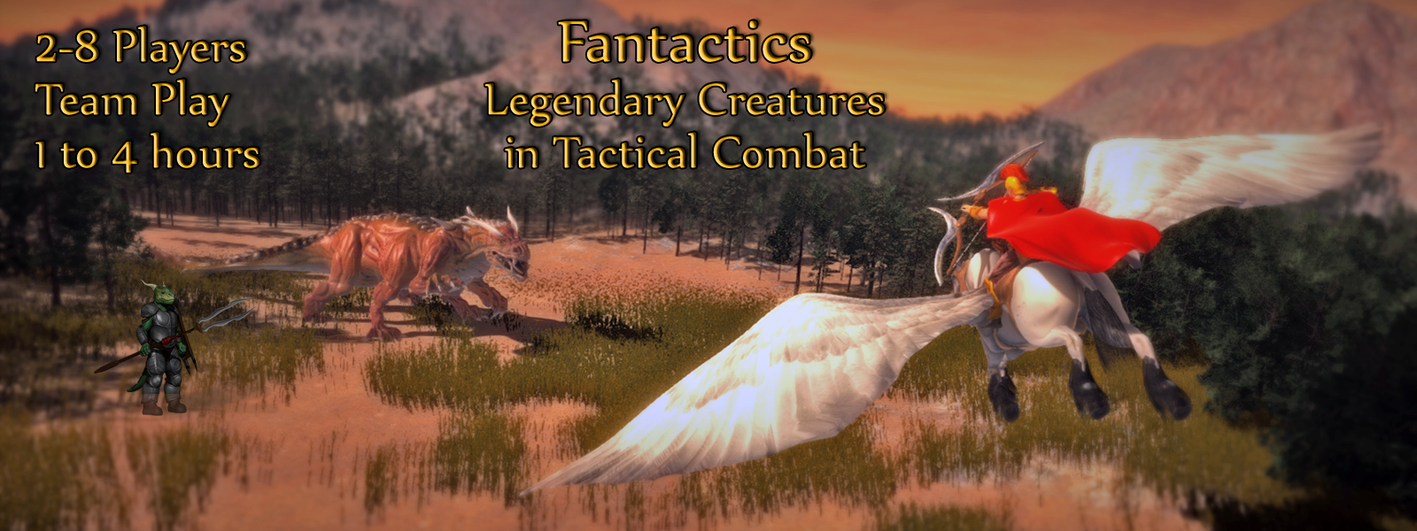 Opposing teams maneuver fantastic legendary creatures in tactical combat. The turn/action game mechanics simulates simultaneous movement and actions. The game is very easy to learn and great for casual gaming, but experienced gamer's will find lots of tactical options and depth. There are fun and challenging scenarios where good tactics can overcome a weak position. Players can join or leave a game in progress but no players are knocked out early; everyone can play until one team wins. We took out the boring stuff and kept in the fun stuff! There are hundreds options in what unit mix an army has and many ways to lay down the map tiles. Even with only a few units there is a wide variety of actions a player may make each turn. Heroism can be a lot of fun!