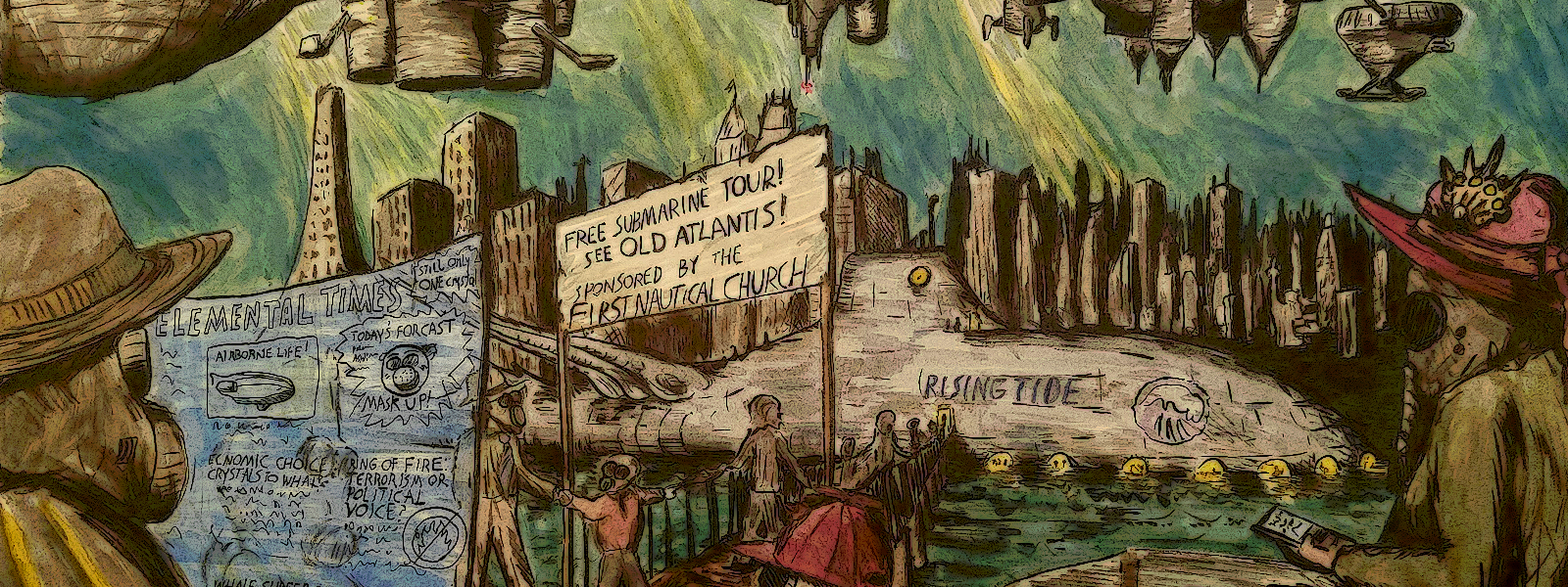 A fragile peace is left in the wake of a thousands year old war. The Aquatarians thrive as a political and economic powerhouse, having mastered the sea. The Stratospherians control the skies with their militaristic lifestyle and massive flying boats. The volatile Fyrians, wield the power of fire and hold an age-old animosity and jealousy toward the dominate Aquatarians; a splinter group is even rumored to control the terrorist organization called The Ring of Fire. The Metallon, an industrious folk with the power to mold metal, have a stranglehold on trade and weapon crafting. They hide themselves away in the well-protected Temple, an industrial-religious compound fronted by the First Nautical Church. And the Terrane, a reclusive sect with power over the element of earth, is the smallest of the factions. They have remained distant, searching vainly for dry land somewhere in the vast sea. Rumors say they are in league with the mysterious and prophetic Mystics and that their earth powers caused the epic deluge that flooded the earth.