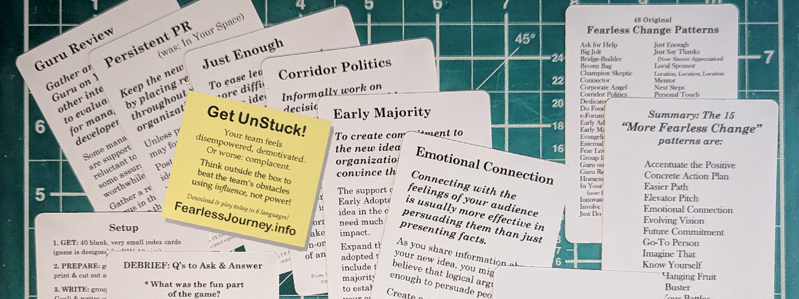 Together your team declares a real Goal, something they can only achieve with the collaboration of others. Then they write cards with their own real Obstacles. The game is to find potential solutions to Obstacles using the Influence Strategy cards, which are excerpts from the classic change patterns book More Fearless Change by Mary Lynn Manns and Linda Rising (used with permission).