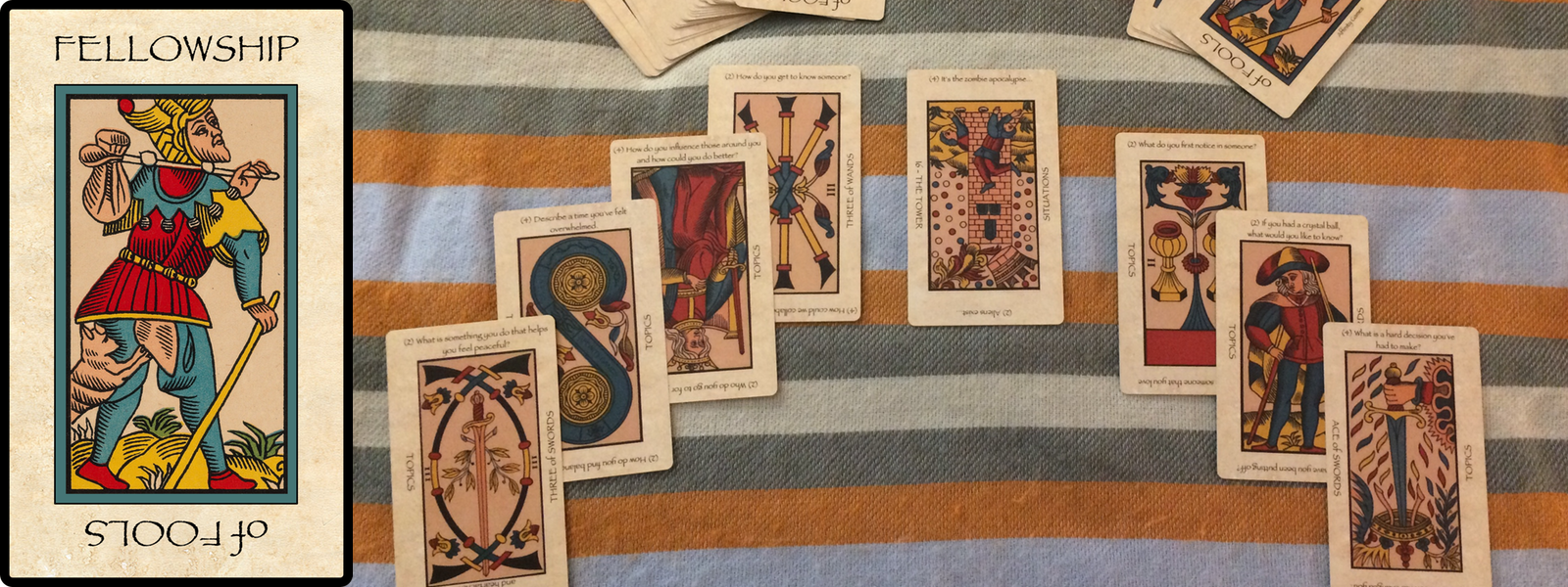 Fellowship of Fools is based on the Tarot, in use since the 14th century for games and since the 17th century for divination (that we know). The Tarot art for Fellowship of Fools dates back to 1761 to its use in France, and is called the Tarot de Marseilles, made by Nicolas Conver of Marseilles. Today, Tarot cards are used primarily for inner reflection and personal development; Fellowship of Fools aims to turn that reflection and development outward, to help build the skills of relating and building intimacy.