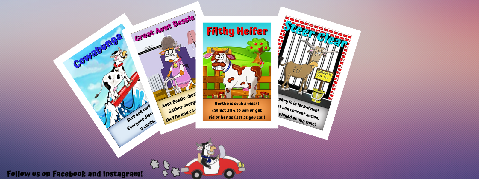 In Filthy Heifer, you're a rancher with a wacky herd of cows! The goal is to gather up or get rid of those Filthy Heifers, the Berthas. Be careful though! Bertha's friends are tricky. They will try and trip you up along the way. Empty your hand, collect all the Berthas or drop a Butcher Block to win the game!