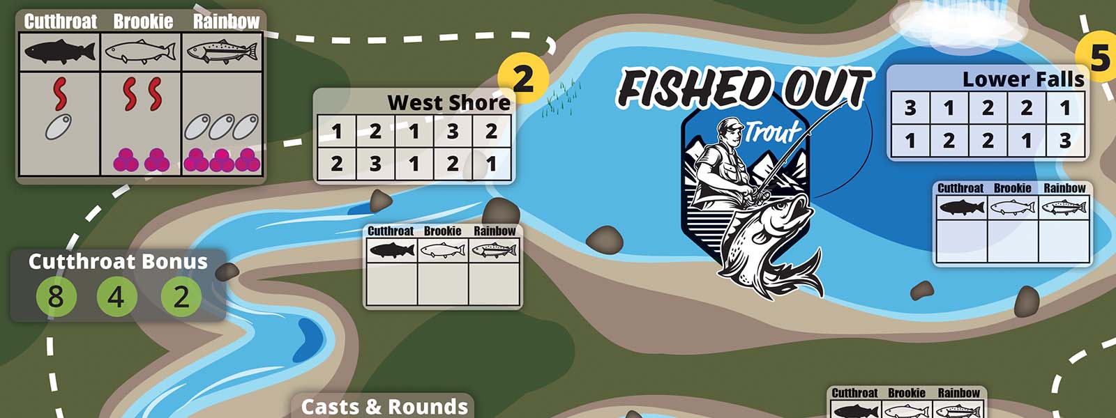 Fished Out: Trout is a roll and write game for angling adventurers. You'll use dry erase markers on the 6 part board and on your player card to track down fish as you roll custom dice that determine your cast quality and lure variety.