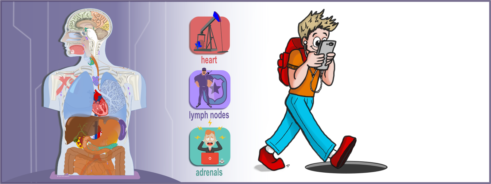 The System Cards deck includes 9 color-coded body systems with most of their organs, each represented by a catchy icon that indicates the organ's function. For example, the 'captain' of the Nervous System represents the frontal lobe's cognitive function. The deck also has 3 Wild Cards and cards with stop and emergency room signs.