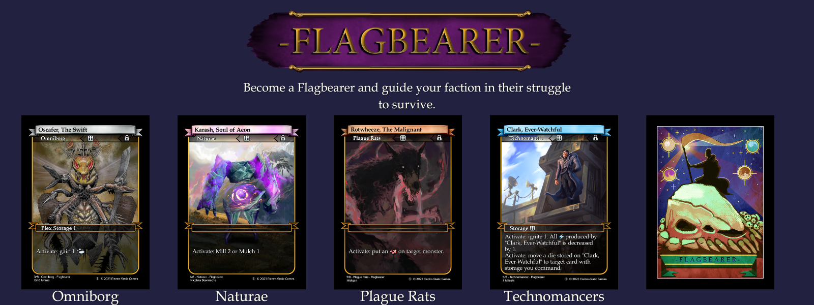 Starter decks are a great way to get started with Flagbearer! Each Starter deck contains a pre-made deck with 40 cards and 1 Flagbearer. These are designed to be easy to learn and provide the opportunity to change them using cards from the respective Faction Box. You can see all Flagbearer cards here.