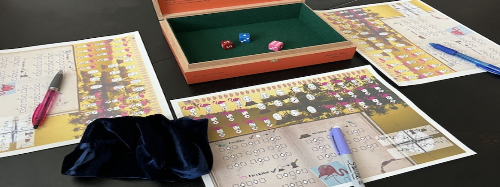 Flamingo is played with 2 blue, 2 pink, and 2 brown dice and a bag for the dice to be drawn from. Players can use their own colors of dice if they prefer, just make sure to note which colors are different. The 6 dice are used for all players simultaneously.