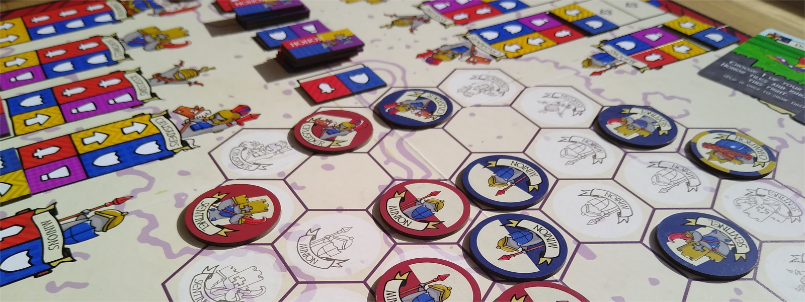 Tableau Building: Both players start with banners that depicts the stats of their pieces. Players draft Honors and add them to their banners. These Honors improve their pieces movement and fighting ability.
