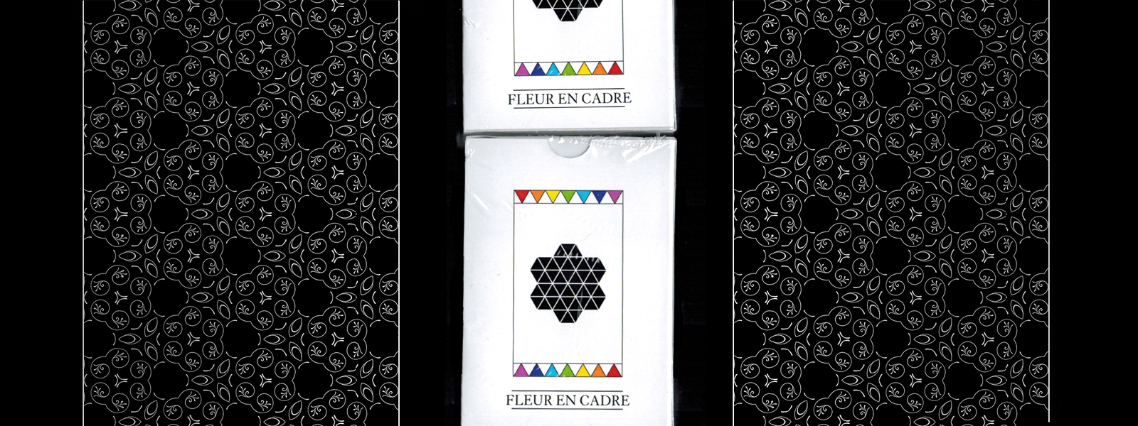 This is a 49 card seven-suit, seven pip system. The name 'FLEUR EN CADRE' relates to the geometrical figure often called 'the flower of life'. It consists of a hexagonal arrangement of 7 circles. This figure is a ubiquitous model for many aspects of the natural world and of the world of myth and human imagination. Both the beauty and functionality of the 'flower of life' work well towards the formation of games and puzzles. The design features a patterned boarder that is numerical and helps to visualize sums of 7. This purpose of this feature is for the game mechanics of visually stacking sequences.