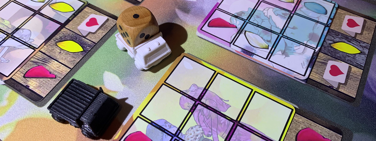 Florist Tourist is a competetive two player drafting and pattern building game. With each order completed, temporary or permanent petals are gained to aid in the completion of future order patterns. The game ends after two of the three level draw piles are depleted.