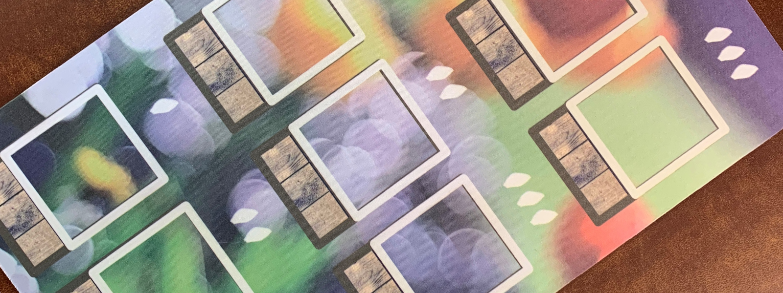 This is 10" x 16" neoprene game mat for Florist Tourist. It acts as a game board to place the three levels of goal/perk cards in the game. These mats provide a cushions surface to make picking cards from the table a bit easier. The art is designed totie in the game. The Game Crafter ships this product in a large flat box so it is noe rolled or folded.