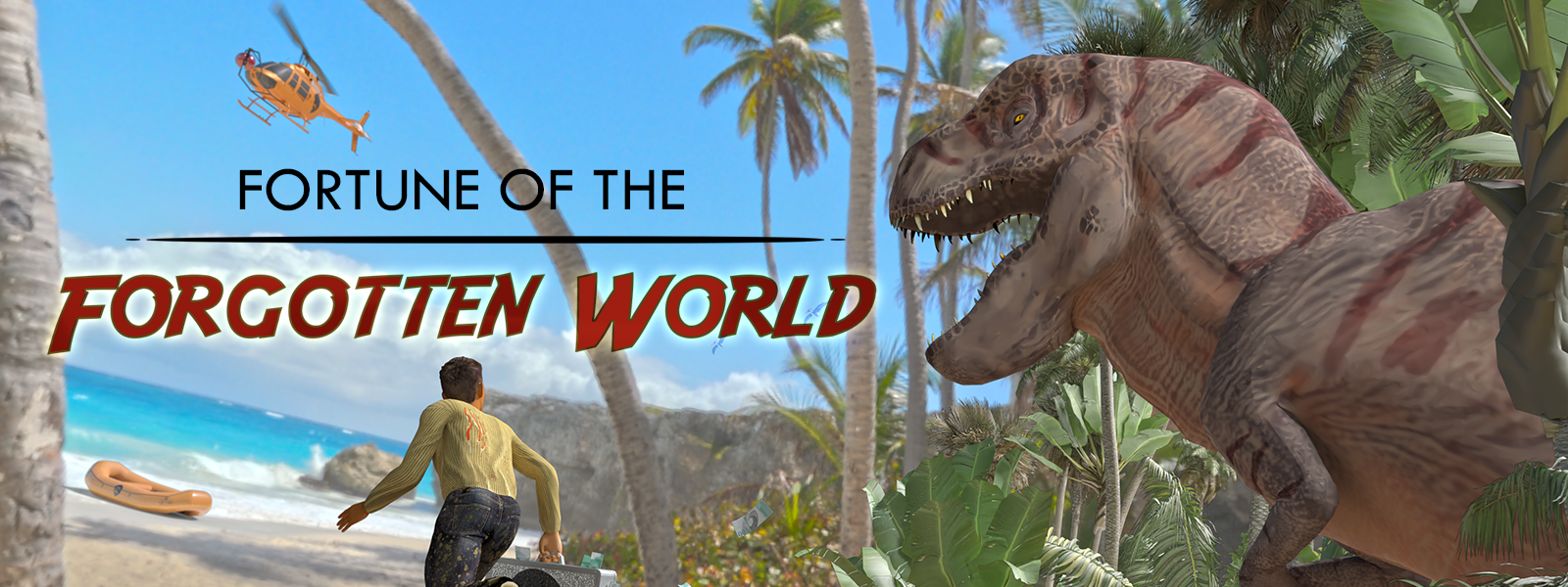 A child of these strange times, FORTUNE OF THE FORGOTTEN WORLD is the highest rated show in history. Located on Island 17A, a scientific experiment gone awry, the television show offers contestants a chance to find a veritable fortune in cash that is stashed on the island, locate the hidden raft and escape to safety, all the while fighting and running from dinosaurs, collecting useful items, fending off other contestants, and competing for the best ratings with the television audience.