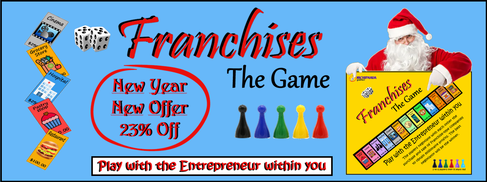 FUN FOR ENTREPRENEURS • The game where all entrepreneurs make a profit. • Only print on demand in six languages to choose from. • The players will negotiate with each other the purchase and sale of Franchise type companies to obtain millionaire profits. • If you buy four equal companies, you form a Franchise. • Players can sell, rent, mortgage, transfer, trade their properties with other players. The best negotiator will be the winner. GREETINGS: if you are tired of being locked up by the pandemic, I invite you to spend more time with your family, playing board games. This past year I invented and designed this board game called "Franchises the Game", made for entrepreneurs and those who like to negotiate with companies. The players will negotiate with each other the purchase and sale of Franchise type companies to obtain millionaire profits. If you buy four equal companies, you form a Franchise. Players can sell, rent, mortgage, transfer, trade their properties with other players. The best negotiator will be the winner. HOW IT WORKS: Within this game, participants will travel the board, square by square, visiting shops and businesses on their way. If a company without an owner is visited, the player can buy it from the Bank or continue his trip without obligation. If the store has an owner, the player is obliged as a customer to buy one of its products or services by paying a registered fee or consumption. To own a Franchise, each entrepreneur must acquire four equal companies. When a business is purchased, the Bank is paid the amount indicated in the box and the Bank will deliver the Title Deed to the new owner. Players can sell, rent, mortgage, transfer, trade their properties with other players. When the player owns the entire franchise, he is called a Franchisor. If a player is interested in hiring a Franchise, the Franchisor will sublease the rights of the company from him, charging a fee for the commercial rights to the entrepreneur (who would be called a Franchisee). ONLY PRINT ON ORDER IN SIX LANGUAGES TO CHOOSE FROM. If you are interested, click on the following link: IN ENGLISH FRANCHISES THE GAME IN ENGLISH IN SPANISH FRANQUICIAS EL JUEGO EN ESPAÑOL IN FRENCH FRANCHISES LE JEU EN FRANÇAIS IN ITALIAN FRANCHISING IL GIOCO IN ITALIANO IN PORTUGUESE FRANCHISING O JOGO IN PORTOGHESE IN GERMAN FRANCHISING DAS SPIEL IN DEUTSCH