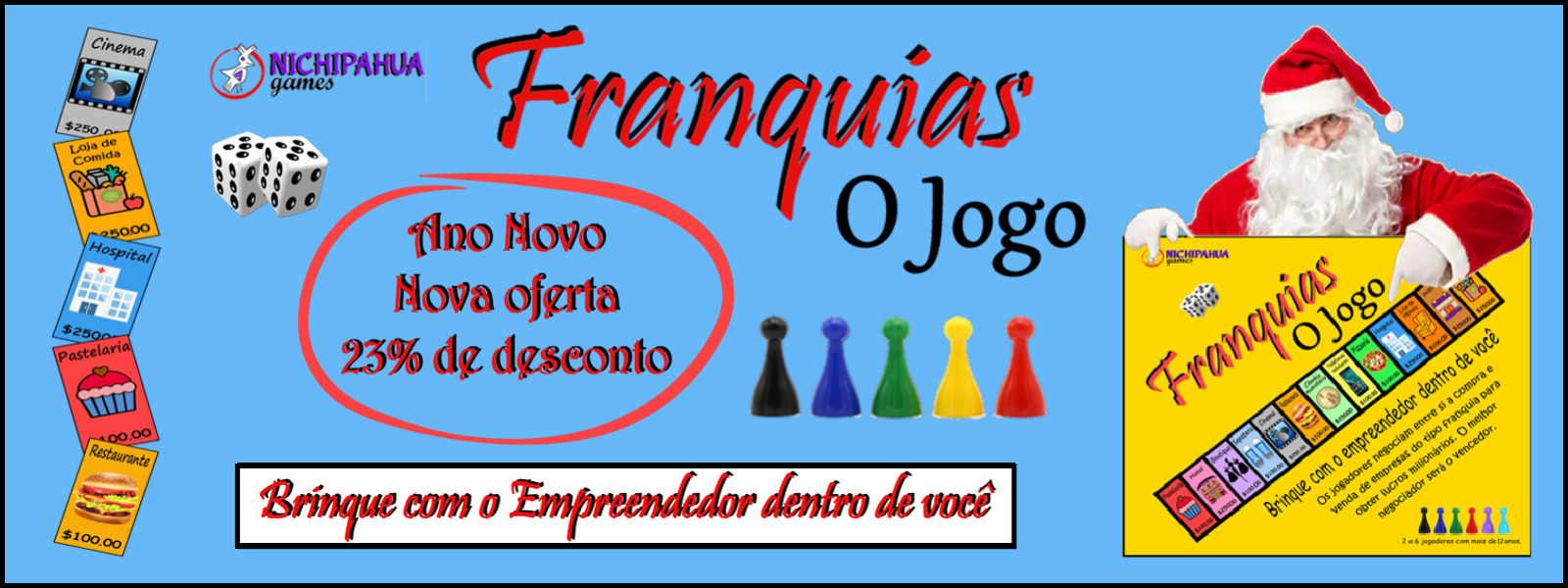 DIVERSÃO PARA EMPREENDEDORES • O jogo onde todos os empreendedores têm lucro. • Imprima somente sob demanda em seis idiomas para escolher. • Os jogadores irão negociar entre si a compra e venda de empresas do tipo franquia para obter lucros milionários. • Se você comprar quatro empresas iguais, você forma uma Franquia. • Os jogadores podem vender, alugar, hipotecar, transferir, negociar suas propriedades com outros jogadores. O melhor negociador será o vencedor. SAUDAÇÕES: se você está cansado de ser preso pela pandemia, convido-o a ficar mais tempo com sua família, jogando jogos de tabuleiro. No ano passado inventei e desenhei este jogo de tabuleiro chamado "Franquias O Jogo", feito para empreendedores e que gostam de negociar com empresas. Os jogadores vão negociar entre si a compra e venda de empresas do tipo franquia para obter lucros milionários. Se você comprar quatro empresas iguais, você forma uma Franquia. Os jogadores podem vender, alugar, hipotecar, transferir e negociar suas propriedades com outros jogadores. O melhor negociador será o vencedor. COMO FUNCIONA: Neste jogo, os participantes irão percorrer o tabuleiro, quadrado a quadrado, visitando lojas e negócios pelo caminho. Se for visitada uma empresa sem dono, o jogador pode comprá-la do Banco ou continuar a sua viagem sem compromisso. Se a loja tiver um proprietário, o jogador é obrigado, como cliente, a comprar um dos seus produtos ou serviços mediante o pagamento de uma taxa de registo ou consumo. Para possuir uma Franquia, cada empresário deve adquirir quatro empresas iguais. Quando um negócio é adquirido, o Banco recebe o valor indicado na caixa e o Banco entrega o Título de Título ao novo proprietário. Os jogadores podem vender, alugar, hipotecar, transferir e negociar suas propriedades com outros jogadores. Quando o jogador possui a franquia inteira, ele é chamado de Franqueador. Se um jogador tiver interesse em contratar uma Franquia, o Franqueador irá sublocar dele os direitos da empresa, cobrando uma taxa pelos direitos comerciais ao empresário (que seria denominado Franqueado). SÓ IMPRIMA POR PEDIDO EM SEIS IDIOMAS PARA ESCOLHER. Se você estiver interessado, clique no seguinte link: EM ESPANHOL FRANQUICIAS EL JUEGO EN ESPAÑOL EM INGLÊS FRANCHISES THE GAME IN ENGLISH EM FRANCÊS FRANCHISES LE JEU EN FRANÇAIS EM ITALIANO FRANCHISING IL GIOCO IN ITALIANO EM PORTUGUÊS FRANCHISING O JOGO IN PORTOGHESE EM ALEMÃO FRANCHISING DAS SPIEL IN DEUTSCH