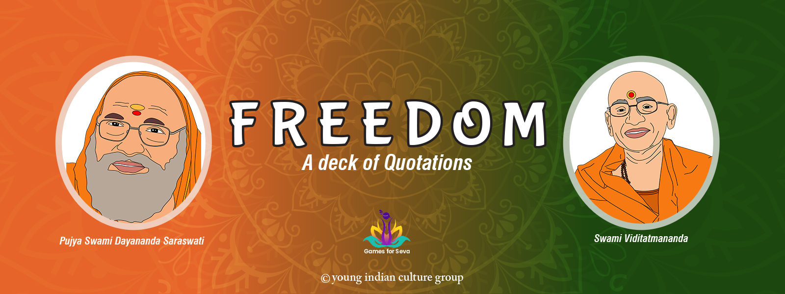 These inspirational quotes have been culled from Pujya Swamiji Dayananda Saraswati & Swami Viditatmananda teachings to serve as guide posts and motivators in living a meaningful life of contribution to society. Here is a link to Arsha Vidya Gurukulam and their program.. These quotations can also be used in many Wisdom based games in our collection, to explore dilemmas and opportunities to meditate.
