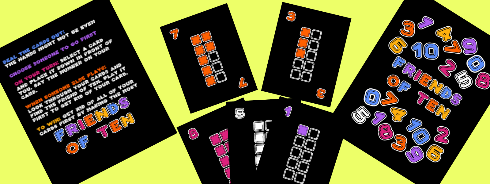 Friends of Ten is a simple card game to help young students learn their basic math skills of pairing. Players take turns playing one card and saying the number it shows, then everyone else must race to find the "friend of ten" lay it down and say the number. Whoever runs out of cards by making pairs first wins!