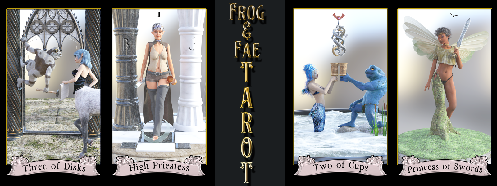 Journey into the twilight realm where there are Frogs and Fae playing at the borderland between the night and the day. This 78 card RWS style deck presents a glimpse of a world seldom seen by humans. Step into the twilight and listen to the wisdom of the Fae as they dance between your fingers.